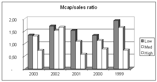 Описанная картина в принципе сохраняется, когда мы переходим к показателю Mcap/Sales (отношение рыночной стоимости к продажам), характеризующему степень доверия к компании на рынке. Но есть одно очень существенное отличие. По этому показателю преимущество концентрированных компаний составляет всего лишь 20%. Соотношение Mcap/Sales для концентрированных компаний - 157%, для среднедиверсифицированных - 134% и для концентрированных 130%. В отличие от показателей прибыли компании со средним уровнем диверсификации здесь заняли позицию ближе к другому краю шкалы - широкодиверсифицированным компаниям.