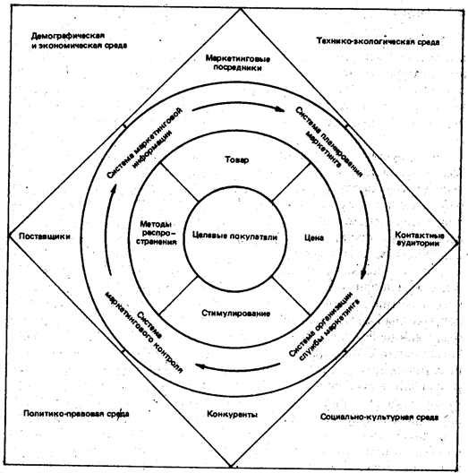 С помощью этих систем фирма следит за маркетинговой средой и приспосабливается к ней. Приспосабливается фирма и к своей собственной микросреде, состоящей из маркетинговых посредников, поставщиков, конкурентов и контактных аудиторий. И наконец, она приспосабливается к макросреде-демографическим и экономическим, политико-правовым, технико-экологическим и социально-культурным факторам. При разработке и позиционировании своего предложения на целевом рынке фирма принимает в расчет все обстоятельства и силы, действующие в маркетинговой среде.