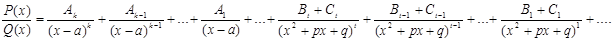 соответствует сумма t простейших дробей типа . Таким образом при разложении знаменателя Q(x) на множители имеет место разложение дроби P(x)/Q(x) на слагаемые.