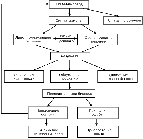Движущая сила (причина или повод) заявляет о себе в виде предупреждающего сигнала. Если сигнал поступает, то возможны два варианта: или их получают, или не получают. Таким же образом: или замечают отсутствие информации, или не замечают. Если сигнал не получен, то мы имеем дело с "движением на красный свет" (первого или второго типа, см. выше). Если предупреждающий сигнал принят, то реакция на него зависит от компании. Точнее, это зависит от конкретного лица, принимающего решение, и от его окружения, среды принятия решения.