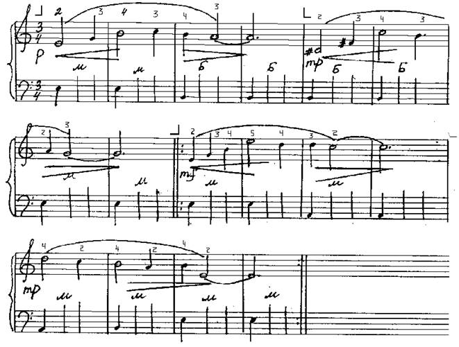 Legato -♫ - связная игра. Пальцы располагаются на клавиатуре, поднимать их высоко нет никакой необходимости. При игре legato не следует с излишней силой давить на клавишу. Вполне достаточно той силы, которая преодолевает сопротивление пружинки и удерживает клавишу в положении упора. Играя кантилену, очень важно чутко осязать поверхность клавиши кончиками пальцев. “Клавишу нужно ласкать! Клавиша любит ласку! На неё только она отвечает красотою звука!” – говорил Н.Метнер. Колотить жёсткими твёрдыми пальцами не нужно. Свободная мягкая кисть вместе с предплечьем должна как бы дышать, пластично следуя за изгибами мелодической линии и помогая тем самым работе пальцев. При этом важно равномерно распределять силу пальцев, особенно при атаке окончании звука, а также следить за плавным ведением меха: