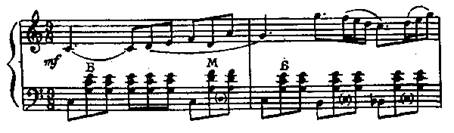 В мелодии, построенной на мелких дробных ритмических длительностях, особенно в быстрых темпах, такое связывание баса с аккордом (“педализация баса”) и выдерживание полной длительности в аккордах сопровождения будет только мешать мелодии, отяжелять и заглушать её. Выдерживание аккордов сопровождения возможно лишь тогда, когда они не заглушают мелодию, а наоборот поддерживают её: