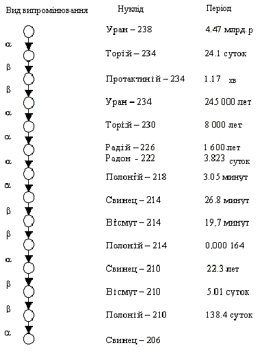 З мал.1 видно, що весь ланцюжок перетворення урану-238 закінчується стабільним нуклідом свинцю. Випущення ядром частки, що складає з двох протонів і двох нейтронів – це альфа-випромінювання; випущення електрона – це бета-випромінювання.