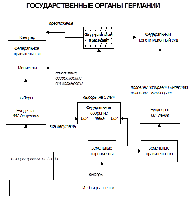 Полномочия президента, его статус в политической жизни той или иной страны определяются прежде всего соответствующими конституционными нормами. В Федеративной Республике Германия конституционное право наделяет исполнительной властью прежде всего главу правительства, а не главу государства – президента. Правда, в конституционном праве ФГГ нет нормы о том, что президент – это глава государства, его статусе в Основном законе говорится только то, что «федеральный президент представляет Федерацию в международно-правовых отношениях»[1]