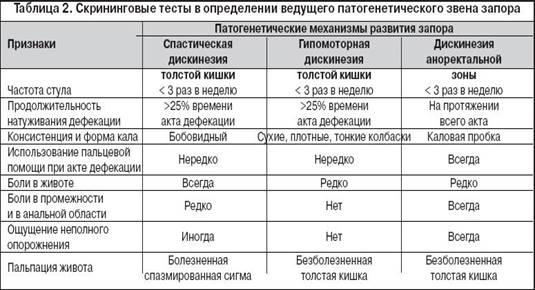 Запор может быть симптомом болезней верхних отделов желудочно–кишечного тракта, толстой и прямой кишки. Поэтому при появлении запора требуется тщательное обследование для установления причин его развития. Детальный анализ клинических проявлений запора позволяет предположить основные механизмы их развития (табл. 2).