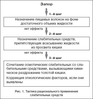 При использовании в свечах бисакодил увеличивает пропульсивную активность толстой кишки, и слабительный эффект наступает через 1 ч. Эту форму препарата применяют для быстрой очистки кишечника при подготовке пациента к срочной операции или инструментальному исследованию. В тонкой кишке бисакодил частично всасывается и, вступая в системный кровоток, увеличивает возможность токсического действия и развития аллергических реакций. Из препаратов, обладающих осмотическими свойствами , наибольшее распространение получили лактулоза и макрогол. Солевые слабительные (натрия сульфат, магния сульфат) для лечения хронических запоров практически не используют из–за болей в животе и формирования жидкого кала, что при частом употреблении приводит к водно–электролитным расстройствам.