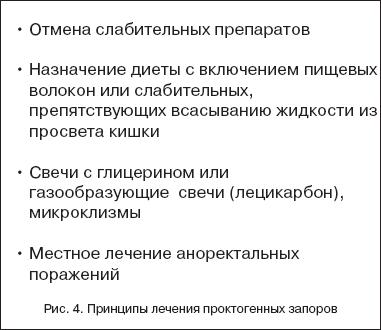 Для лечения запоров, обусловленных спастической дискинезией и сопровождающихся болями в животе, следует использовать спазмолитики . Препараты должны обладать высокой избирательностью действия на спазмированные участки кишки, не нарушать ее перистальтическую активность, эффективно купировать болевой синдром, не влиять на функцию других органов. Из миотропных спазмолитиков наиболее эффективно купируют болевой синдром в кишке пинаверия бромид, мебеверина гидрохлорид, отилония бромид и препараты, обладающие прямым действием на внутриклеточные процессы в миоците. Однако, по данным мета–анализа 26 клинических исследований, спазмолитики миотропного действия в виде монотерапии существенно не влияли на купирование запоров [3]. Поэтому для получения регулярного стула их следует принимать со слабительными средствами, увеличивающими объем кала и размягчающими его консистенцию (рис. 3). Схема лечения запоров, обусловленных функциональной аноректальной обструкцией, представлена в табл (рис. 4). При сниженной чувствительности слизистой оболочки прямой кишки назначают свечи, освобождающие углекислый газ, индуцирующий дефекационный рефлекс (лецикарбон).