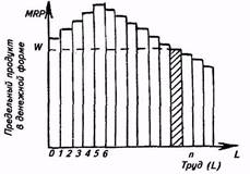 . В данном случае — это количество работниц в размере n человек. Предельный продукт n-й работницы (он заштрихован) соответствует заработной плате (W). Предельная производительность n-го работника является мерой вклада труда (L) в производство продукта.