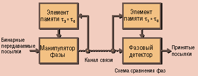 Для реализации идеи надо было на передаче изменить метод манипуляции: фаза излучаемой посылки должна отсчитываться от фазы предшествующей посылки. Так как в основе метода лежит относительный отсчет фазы, то метод был назван относительной фазовой манипуляцией (ОФМ); в литературе применяется и его второе название - относительная фазовая телеграфия (ОФТ). Кратко сформулируем суть этого метода. ОФМ - это способ передачи дискретных сигналов, при котором при передаче фаза каждой N-й посылки отсчитывается от фазы предшествующей ей (N - 1)-й посылки, а при приеме знак принимаемой посылки определяется сравнением фаз каждой N-й посылки с фазой (N - 1)-й посылки. Таким образом, при ОФМ устанавливается полная однозначность фаз между опорной и несущей информацию посылками и устраняется явление "обратной работы". Очевидно, что в начале сеанса связи для передачи первой информационной посылки необходима передача одной избыточной посылки, по которой отсчитывается фаза первой информационной посылки.