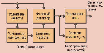 Первое отечественное исследование возможности использования фазовой манипуляции (ФМ) в каналах связи выполнено А. А. Пистолькорсом в 1932 г. Затем ФМ исследовалась Д. В. Агеевым и В. И. Сифоровым. В этих работах было показано преимущество ФМ перед частотной манипуляцией (ЧМ) и предложен ряд схем детекторов ФМ-сигналов. Наиболее известная и остроумная из них - "схема Пистолькорса": сигнал ФМ на приеме возводится в квадрат, в результате устраняется манипуляция, но в два раза повышается частота, которая затем вдвое понижается делителем, что и образует опорное колебание, необходимое для определения ФМ-сигналов.