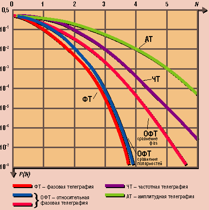Рис. 4. Зависимость вероятности ошибки P(N) от соотношения сигнал/шум для различных видов манипуляции
