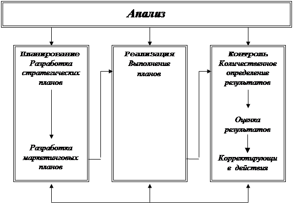 Процесс планирования охватывает четыре этапа: анализ, планирование, реализация и контроль. На рис. 1.1 показана взаимосвязь этих составляющих, которые являются одинаковыми для стратегического планирования, маркетингового планирования и планирования для любых других целей.