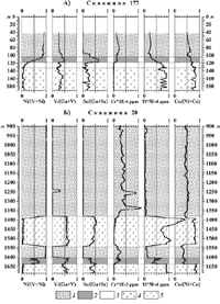Действительно, разрез скважины можно разделить на два ритма - нижний и верхний. Верхний ритм вскрывается первыми 850 метрами керна, причем его геохимическая структура ритма в деталях повторяет структуру характерную для пород Шалозёрского блока [1]. Снизу вверх наблюдается последовательная смена оливиновых, двупироксеновых и двупироксен-плагиоклазовых кумулатов, а зона двупироксеновых кумулатов осложнена перидотитовым прослоем (интрвал керна 567 589 м.). В разрезе нижнего ритма (850 1180 м) также наблюдается последовательная смена преимущественно оливиновых, двупироксеновых и двупироксен-плагиоклазовых пород, но в отличии от разреза верхнего ритма он характеризуется совершенно другим мотивом геохимической структуры. Для этой толщи характеры повышенные содержания когерентных элементов (Ni, Cr, V) и "относительно некогерентного" титана при пониженных концентрациях Sc. Это находит отражение в увеличении показателей Ni/(V+Ni) и V/(Ga+V) на фоне снижения Sc/(Ga+Sc). Указанные геохимические различия верхнего и нижнего ритмов позволяют высказать сомнения в реалистичности предположений о механическом сдвоении одного и того же разреза в керне этой скважины, которое могло произойти за счет тектонических сдвигов.