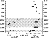 с сосуществующими фемическими минералами. Это обусловлено тем, что коэффициенты диффузии двухвалентных катионов в шпинелиде примерно в 1.5 раза выше, чем в оливине [20]. Таким образом, можно предположить, что магнезиальность реально наблюдаемого хромита должна коррелировать с изменением состава Ol, который на 95-98% слагает исследуемые адкумулаты. Эти вариации приведены на Рис 3. Как и следовало ожидать, в неметаморфизованной части разреза состав хромита изменяется параллельно составу Ol. Далее вверх по разрезу магнезиальность минералов понижается до значений, характерных для приконтактовых пород. Таким образом, зона оливиновых кумулатов Аганозёрского блока до серпентинизации характеризовалась максимумом показателя валовой магнезиальности, расположенного вблизи середины её разреза.
