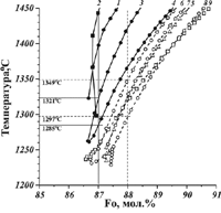 Таким образом, если принять, что для Аганозерского блока средний "равновесный" состав интрателлурических кристаллов отвечал Fo87, то температура исходного магматического расплава могла варьировать от 1285o