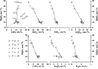 . Вероятно это связано с неизохимичностью процессов серпентинизации. Поэтому для термометрических расчётов следует выбирать образцы с наименьшими вторичными изменениями: такие породы вскрыты глубокими скважинами 20 и 67. Для последующих вычислений были отобраны 9 составов (Табл.1, ан. 1-9), представляющих 4 образца из скв.20 и 5 образцов из скв. 67. Характерно, что на графиках (Рис. 6) фигуративные точки их составов "выстраиваются" в сублинейные тренды.