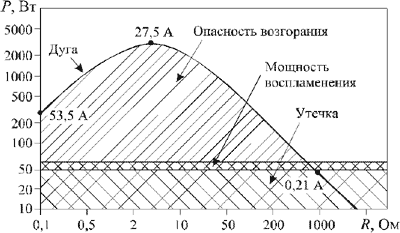 Из графика следует, что уже при сопротивлении изоляции ниже 1000 Ом возможно выделение мощности, достаточной для воспламенения изоляции.