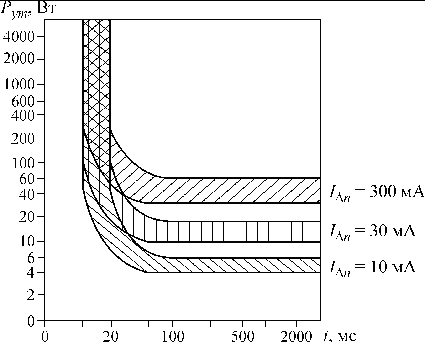 РИС.3. Зависимость мощности, выделяемой в месте повреждения изоляции, от времени отключения УЗО с уставками по дифферен-циальному току 10, 30 и 300 мА