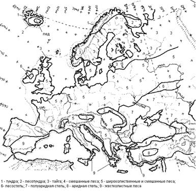 Рис. 3. Последнее оледенение: 1 – полярная пустыня; 2 – тундра; 3 – тундростепь; 4 – хвойные леса; 5 – смешанные леса; 6 – аридная степь; 7 – полупустыня