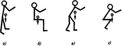 Схема биомеханического анализа рабочей позы при устойчивой (а и б) и неустойчивой (в и г) позах: а, в — стоя; б, г — сидя