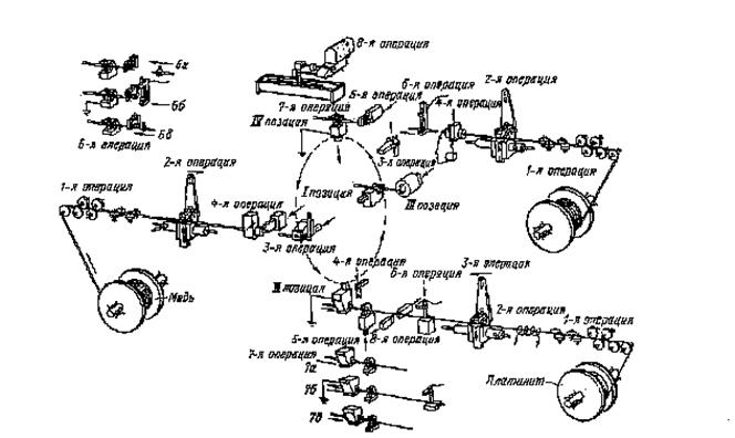 . Штамповка корпуса цоколя Е27-1 из стальной ленты производится на кривошипном прессе-автомате с грейферной подачей отштампованных корпусов. Из ленты шириной 54 мм вырубаются диски диаметром 55,5 мм с шагом 54 мм так, что края дисков оказываются срезанными, а от ленты остаются маленькие не связанные между собой треугольники. На первой операции вместе с вырубкой производится и первая вытяжка стаканчика диаметром 28,5 мм, который грейфером передаётся на вторую вытяжку, совмещённую с пробивкой отверстия диаметром 15 мм, а затем на заключительную операцию-обрубку облоя и калибровку, в результате которой стаканчик получает диаметр 26 мм, а высоту 22 мм. Таким образом, штамповка корпуса занимает три позиции и обычно на пресс-автомат устанавливаются две ленты.