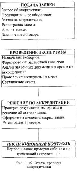Весь процесс аккредитации проходит в четыре этапа. Рекомендации по аккредитации Р 50.4.001-96 предусматривают пять этапов, содержание которых полностью совпадает с рассматриваемым вариантом. Каждый этап состоит из стандартных процедур (рис.1.19).