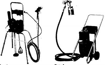 (рис. 3.3.2, а) основан на использовании насоса с двумя диафрагмами. Сжатый воздух, попадая в установку, разделяется на два потока. Первый поток направляется по специальному шлангу через редуктор давления в пистолет для фиксирования факела. Другой поток поступает через второй редуктор давления к насосу. Насос всасывает краску прямо изконтейнера и доставляет ее к распылительному пистолету. Такие агрегаты находят широкое применение на промышленных предприятиях.