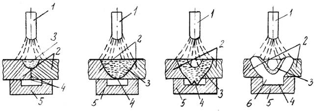 1 – электрод; 2 – свариваемый металл; 3 – расплавленный металл сварочной ванны; 4 – окисные пленки на поверхности соединяемых кромок; 5 – подкладка с канавкой; 6 – металл шва.