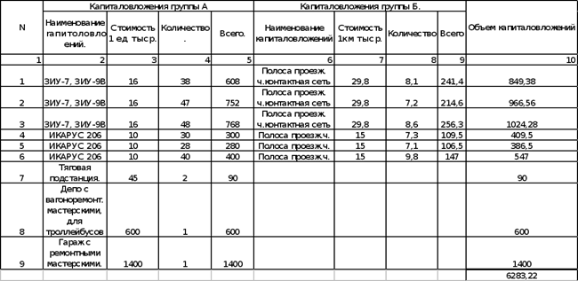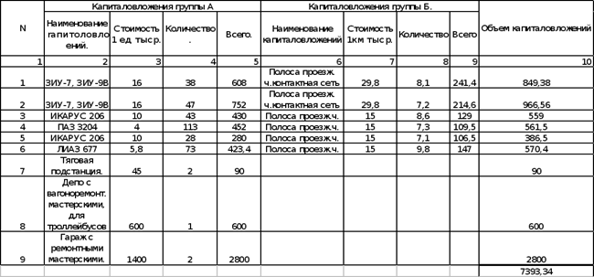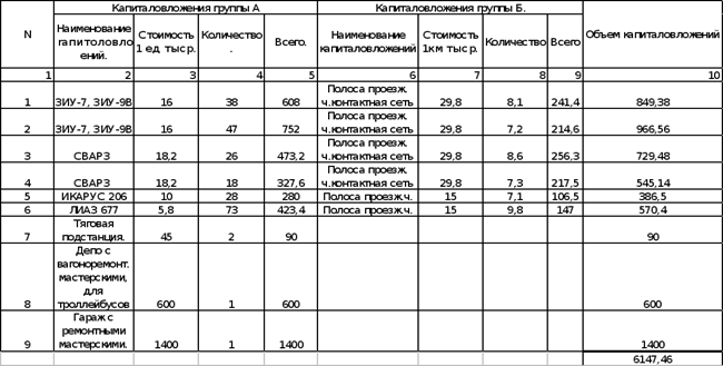 Капиталовложения группы А слагаются из затрат на подвижной состав, на депо, гаражи и ремонтные мастерские, на электрохозяйство тяговые подстанции.