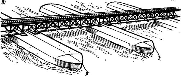 наплавныемостыс плавучими опорами из понтонов или барж, устраиваемые на широких и глубоких реках, когда постройка постоянных опор не оправдывается размерами движения, а также в случае временной необходимости, например на период постройки капитального моста. Для пропуска по реке судов в наплавных мостах применяют выводные секции, а на период ледохода и ледостава такие мосты разбирают (рис. 1.2, д).