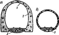 Конструкцию, служащую для постоянного закрепления тоннельной выработки, называют обделкой. Входные звенья обделки горных тоннелей, называемые порталами, несколько выдвинуты вперед. Очертание обделки внутри тоннеля может быть подковообразным (см. рис. 1.7, а) для горных тоннелей, круговым (см. рис. 1.7, б)