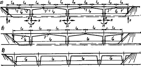 виадукипри пересечении дорогой глубоких и сухих логов, оврагов, горных ущелий, сооружаемые взамен высоких (более 15— 20 м) насыпей (рис. 1.2, в);
