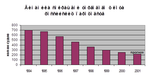 Анализ состояния морского транспорта за последние три года показывает, что флот, контролируемый Россиией, в целом сократился на 27,5%, флот морских пароходств – в 2 раза, флот просих судоходных российских компаний, активно развивавшийся в 1995-1996 гг., также стал сокращаться (в 1999 г. по сравнению с 1996 г. уменьшился в 1,5 раза).