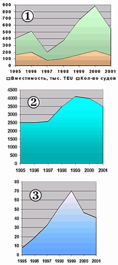 Еще одним наглядным параметром представляется доля контейнеровозов вместимостью свыше 5 тыс. TEU в общей емкости заказанных судов (см. Диаграмма 3). Если в 1995 году подобные суда составляли лишь 7,7%, то за 4 года это число выросло в 10 раз, после чего резко понизилось до 46,3% в 2000 году и продолжало понижаться до 40,7% в 2001 году.