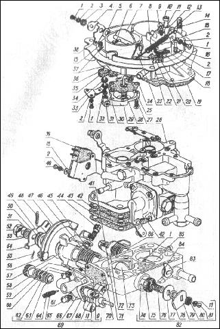 1 – винт; 2 – шайба; 3 – шайба; 4 – рычаг; 5 – шайба; 6 – винт; 7 – заслонка воздушная; 8 – крышка клапана разбалансировки; 9 – винт; 10 – винт эконостата; 11 – шайба; 12 – распылитель эконостата; 13 – рычаг; 14 – шпилька; 15 – шайба; 16 – фиксатор; 17 – прокладка; 18 – клапан разбалансировки; 19 – прокладка; 20 – пружина; 21 – пружина; 22 – прокладка; 23 – ось воздушной заслонки; 24 – диафрагма; 25 – шайба; 26 – корпус поплавковой камеры; 27 – винт; 28 – пружина; 29 – крышка; 30 – шайба; 31 – хомут; 32 – гайка; 33 – пружина; 34 – шайба; 35 – тарелка; 36 – тяга; 37 – шплинт; 38 – рычаг; 39 – микропереключатель; 40 – винт; 41 – гайка; 42 – прокладка; 43 – прокладка; 44 – винт; 45 – гайка; 46 – пружина; 47 – сектор с упором; 48 – пружина; 49 – шайба; 50 – кольцо; 51 – шайба; 52 – гайка; 53 – шайба; 54 – рычаг; 55 – шплинт; 56 – муфта; 57 – рычаг; 58 – винт; 59 – шайба; 60 – винт; 61 – винт; 62 – пружина; 63 – винт; 64 – винт; 65 – кольцо; 66 – корпус экономайзера; 67 – прокладка; 68 – клапан экономайзера; 69 – экономайзер; 70 – прокладка; 71 – шайба; 72 – рычаг; 73 – заслонка дроссельная; 74 – валик; 75 – золотник; 76 – пружина; 77 – шайба; 78 – втулка; 79 – винт; 80 – втулка; 81 – винт; 82 – валик в сборе; 83 – валик с рычагом; 84 – втулка; 85 – заслонка дроссельная; 86 – пружина.