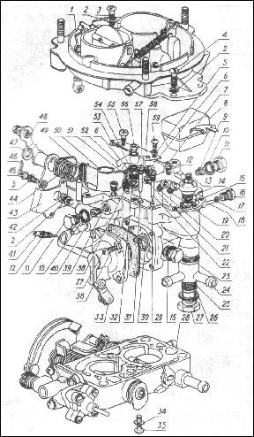 1 – крышка; 2 – клапан разбалансировки поплавковой камеры (только на карбюраторах К-151В); 3 – поплавок; 4 – воздушный жиклёр переходной системы вторичной системы камеры; 5 – топливный жиклёр переходной системы вторичной камеры; 6 – резьбовой винт-держатель распылителя эконостата; 7 – главный воздушный жиклёр вторичной камеры; 8 – распылитель эконостата; 9 – эмульсионная трубка главной дозирующей системы вторичной камеры; 10 – держатель распылителя ускорительного насоса с нагнетательным клапаном; 11 – распылитель ускорительного насоса; 12 – воздушная заслонка; 13 – вставной малый диффузор вторичной камеры с распылителем; 14 – главный воздушный жиклёр первичной камеры; 15 – эмульсионная трубка главной дозирующей системы первичной камеры; 16 – блок топливного и воздушного жиклёров холостого хода с эмульсионной трубкой; 17 – эмульсионный жиклёр системы холостого хода; 18 – второй воздушный жиклёр системы холостого хода; 19 – регулировочная игла на жиклёре дренажного канала ускорительного насоса; 20 – ограничитель хода всасывающего шарикового клапана ускорительного насоса; 21 – корпус карбюратора; 22 – перепускной (дренажный) жиклёр ускорительного насоса; 23 – шарик всасывающего клапана ускорительного насоса; 24 – пружина хода всасывания диафрагмы ускорительного насоса; 25 - диафрагма ускорительного насоса; 26 – крышка диафрагмы ускорительного насоса; 27 – рычаг привода ускорительного насоса; 28 – главный топливный жиклёр первичной камеры; 29 – штуцер клапана ЭПХХ; 30 – диафрагма клапана ЭПХХ; 31 – запорный клапан ЭПХХ; 32 – вставной пластмассовый ограничитель поворота винта "качества"; 33 – винт регулировки состава смеси ("винт качества") на холостом ходу; 34 – разгрузочное поддиафрагменное отверстие в корпусе клапана ЭПХХ; 35 – корпус экономайзера принудительного холостого хода (узел холостого хода); 36 – отверстие регулируемого воздушного канала системы холостого хода; 37 – винт регулировки частоты вращения коленчатого вала двигателя на холостом ходу; 38 – прокладка узла холостого хода; 39 – дополнительный винт регулировки состава смеси на главной топливо подающей ветви системы холостого хода (только на ранних модификациях карбюраторов); 40 – переходное щелевое отверстие системы холостого хода; 41 – дроссельная заслонка первичной камеры; 42 – кулачок привода рычага ускорительного насоса; 43 – ролик рычага ускорительного насоса; 44 – входное окно воздушного канала системы холостого хода; 45 – дроссельная заслонка вторичной камеры; 46 – термоизоляционная наборная прокладка корпуса карбюратора; 47 – корпус дроссельных заслонок; 48 – штуцер отбора разряжения к электромагнитному клапану управления ЭПХХ; 49 – штуцер отбора разряжения к вакуумному регулятору опережения зажигания; 50 – главный топливный жиклёр вторичной камеры; 51 – штуцер отбора разряжения к клапану рециркуляции отработавших газов; 52 – силовая цепь блока управления ЭПХХ; 53 – цепь микропереключателя управления ЭПХХ; 54 – фильтр на вентиляционном штуцере электромагнитного клапана управления ЭПХХ; 55 - электромагнитный клапан управления ЭПХХ; 56 – винт крепления топливных штуцеров поплавковой камеры; 57 – топливный фильтр; 58 – топливный штуцер; 59 – пробка на стенке поплавковой камеры; 60 – запорный клапан поплавкового механизма; 61 – серьга запорной иглы; 62 – язычок поплавка; 
