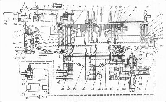 1 – крышка карбюратора; 2 – шайба; 3 – винт; 4 - винт; 5 – шайба; 6 – жиклёр; 7 – жиклёр; 8 – поплавок; 9 – жиклёр; 10 – прокладка; 11 – пробка; 12 – кольцо; 13 – клапан игольчатый; 14 – корпус игольчатого клапана; 15 – прокладка; 16 – пробка; 17 – шайба; 18 – ось; 19 – жиклёр; 20 – жиклёр; 21 – трубка эмульсионная; 22 – винт; 23 – пробка; 24 – штуцер; 25 – сетка фильтра; 26 – прокладка; 27 – болт штуцера; 28 – корпус дроссельных заслонок; 29 – жиклёр; 30 – пружина; 31 – шарик Æ 3,175 мм; 32 – трубка эмульсионная; 33 – крышка; 34 – шайба; 35 – винт; 36 – диафрагма; 37 – винт; 38 – блок-жиклёр; 39 – жиклёр; 40 – жиклёр; 41 – винт; 42 – винт; 43 – кронштейн микропереключателя; 44 – пружина; 45 – винт; 46 – шплинт; 47 – шайба; 48 – рычаг; 49 – пружина; 50 – прокладка; 51 – прокладка; 52 – распылитель; 53 – зажим кронштейна тяги; 54 – прокладка; 55 – болт; 56 – клапан; 57 – винт; 58 – кронштейн; 59 – винт.