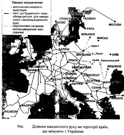 · на міжнародних транспортних коридорах сусідніх країн ведуться роботи щодо впровадження швидкісного руху. Є ділянки швидкісного руху, на яких уже зараз максимальна маршрутна швидкість у 1,3... 1,9 раза перевищує аналогічну на залізницях України. Однак встановлені максимальні швидкості на транспортних коридорах, що прилягають до України, зокрема до Львівської залізниці, поки що не перевищують 120 км/год;