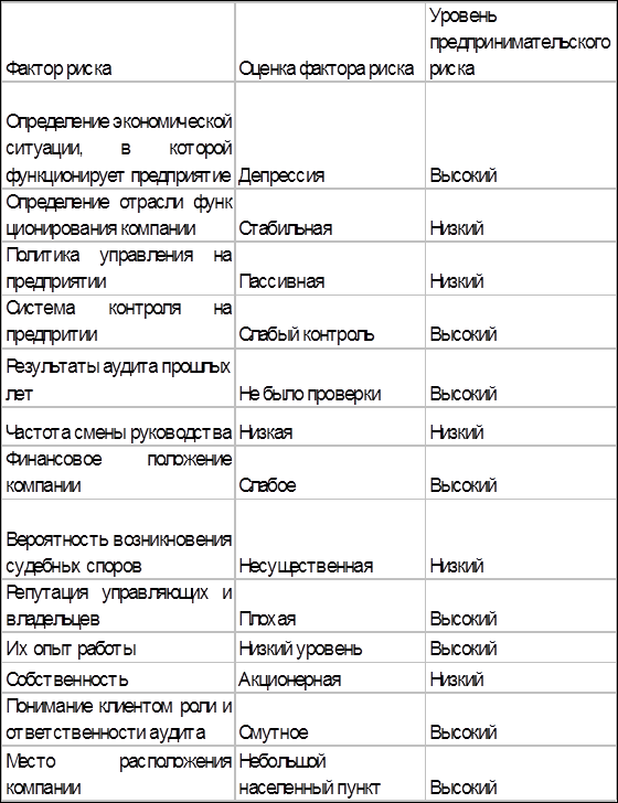 Предпринимательский риск - влияние не зависящих от аудитора обстоятельств деловой активности клиента на ухудшение его финансовых позиций в то время как аудитор подтвердил их устойчивость.