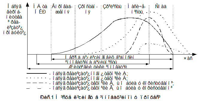 Місце лізингу в інноваційному процесі показано на рис.1. з якого видно, що життєвий цикл інновацій складається з низки етапів, починаючи науково-дослідними та проектно-конструкторськими роботами і закінчуючи спадом та зняттям продукції з виробництва. Лізингова діяльність передбачає використання готової продукції. Для належного забезпечення своїх клієнтів необхідним їм майном лізингова компанія може здавати в лізинг різні види техніки: нову (варіант А, Б) і ту, що була у користуванні (варіант В, Г) та досягати при цьому різних обсягів реалізації. Можливий випадок, коли техніка використовується і після завершення її життєвого циклу (в.Б, Г).