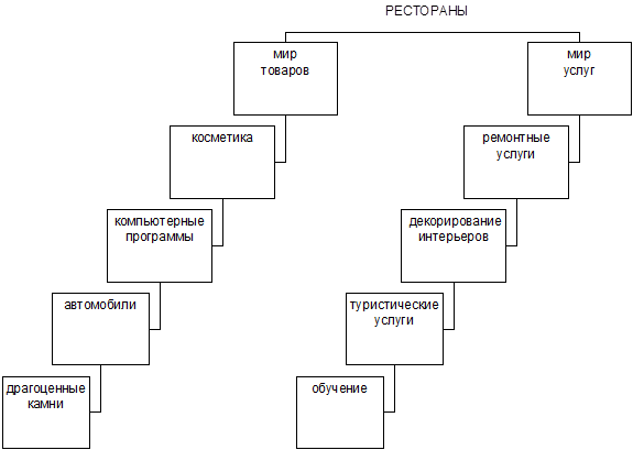 В данной схеме в качестве границы между миром товаров и миром услуг выступает общественное питание. Это связано с тем, что предприятия данной отрасли предназначены для производства (сходны в этой функции с пищевой промышленностью), реализации (сходны с торговлей) и организации потребления кулинарной продукции.