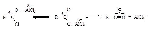 В случае реакции ацилирования в качестве ацилирующего агента как правило применяются ацилхлориды в присутствии кислот Льюиса (чаще всего хлорида алюминия). В таком случае реакция начинается с взаимодействия àöèëõëîðèäà ñ êàòàëèçàòîðîì с обðàçîâанием собственно ýëåêòðîôèëüíого àãåíòа: