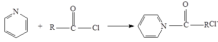 Òðåòè÷íûå àìèíû âçàèìîäåéñòâóþò ñ õëîàíãèäðèäàìè, äàâàÿ ÷åòâåðòè÷íûå ñîëè, êîòîðûå ñàìè ÿâëÿþòñÿ àöèëèðóþùèìè àãåíòàìè. Примером такой реакции служит образование солей в пиридине. òàêàÿ ñîëü àöèëèðóåò âîäó. Ïðîöåññ â öåëîì ïðåäñòàâëÿåò ñîáîé ãèäðîëèç àöèëãàëîãåíèäà, êàòàëèçèðóåìûé ïèðèäèíîì.