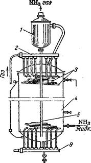 Жидкий аммиак подается в испаритель (конденсатор) снизу, газообразный испарившийся аммиак отводится по трубке в ловушку /. Здесь задерживаются капли жидкого аммиака, уносимые газом; жидкость стекает обратно в аппарат через вертикальную трубу 5.