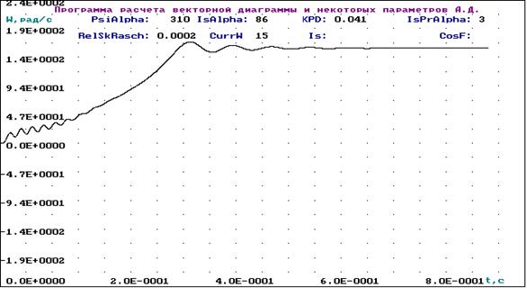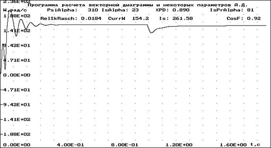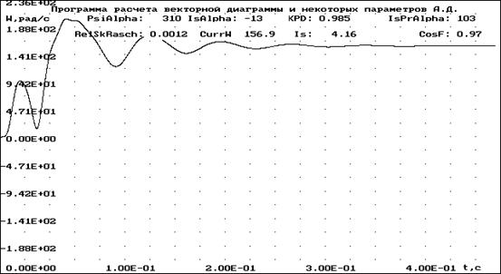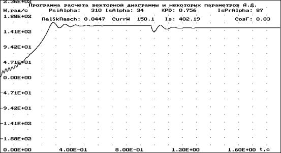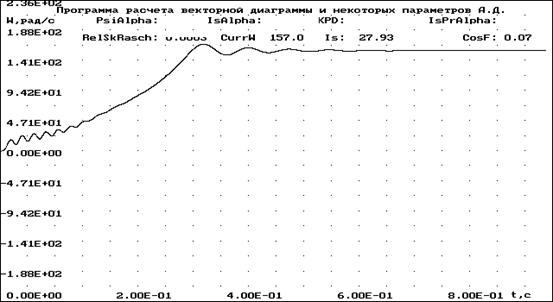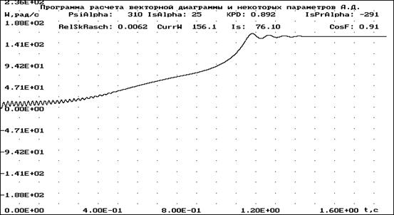 Для оперативного контроля за процессом моделирования работы АД предусмотрен вывод графической зависимости w(t) на экран график зависимости w(t), частоты вращения вала двигателя, момента на валу двигателя, КПД, коэффициента мощности, питающего напряжения.