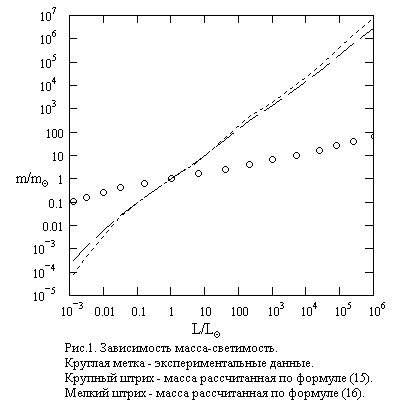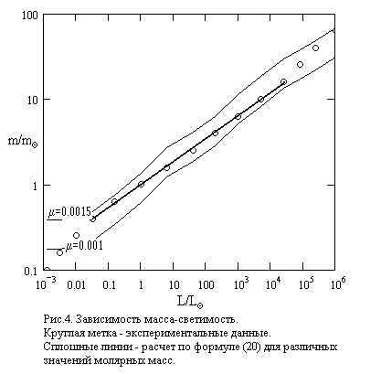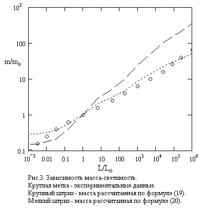 На рис.3. представлены три зависимости масса-светимость, полученные из экспериментальных данных [3] и на основании расчета по формулам (19) и (20). Из рисунка видно: данные расчета по формуле (19) не согласуются с данными эксперимента, что и следовало ожидать после положительного результата проверки соотношения (18). Вычисления с использованием (20) дают удовлетворительное согласие с экспериментальными данными.