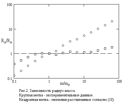 На рис.2. круглой меткой представлены экспериментальные данные значений радиусов и квадратной меткой их измененные значения согласно (18) в зависимости от массы звезд главной последовательности. Расчеты и построение проведены на основании экспериментальных данных работы [3]. Из рис.2. видно: соотношение (18) с хорошей точностью выполнимо для значений относительных масс , находящихся в интервале , что составляет значительную часть звезд главной последовательности. Звезды с характеристиками, не удовлетворяющими соотношению (18), очевидно не соответствуют положениям 1 и 2, сформулированным в начале этого раздела. Тем самым, есть веские основания полагать, что отличие величин и имеет релятивистскую природу.
