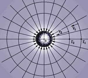 Таким образом, скорость движения эфира к центру небесного тела обратно пропорциональна квадрату расстояния до него: