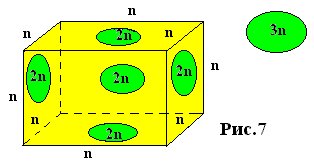 Если это множество разбить на подмножества по три точки - A, B, C, то нетрудно видеть, что пересечение подмножеств A, В, C аналогично пересечению подмножеств из трех точек. В 9-мерном пространстве это означает, что три его трехмерных подпространства могут пересекаться в одной точке и быть взаимно ортогональными. Таким образом, 3-мерное подпространство в этом случае может играть роль координатной "оси". Тогда то, что соответствует 2-мерным плоскостям в 3-мерном пространстве, здесь будет 6-мерным подпространством. Мы взяли по три точки в А, В, С только в качестве примера. Пусть в А, В, С будет по n точек. Тогда мы получим аналог 3n -мерного пространства. Куб, например, в таком пространстве будет выглядеть следующим образом (рис.7)