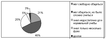 Подавляющее большинство иностранных студентов (76%) не знали русского языка, когда приехали в Россию, 21% знал всего лишь несколько фраз или отдельных слов. После года обучения на подготовительном факультете картина языковой компетентности кардинально меняется: 21% иностранных студентов могут свободно общаться на русском языке, хотя большинство испытывают значительные языковые трудности в учебе (рис. 3).